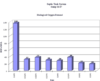 Graphs on the following pages demonstrate the bio-remediation of a septic tank system, which had ceased to operate and was brought into substantial EPA compliance and odors gone within eight days of infusion of biocatalytic agents. The system was stabilized within 60 days while digestion of accumulated solids progressed. Anticipated length for total digestion was an additional 90-120 days with treatment moving to maintenance infusion at that time.